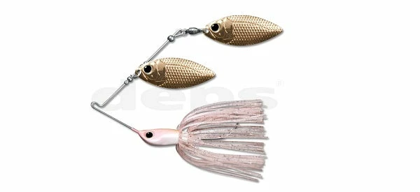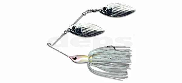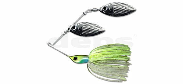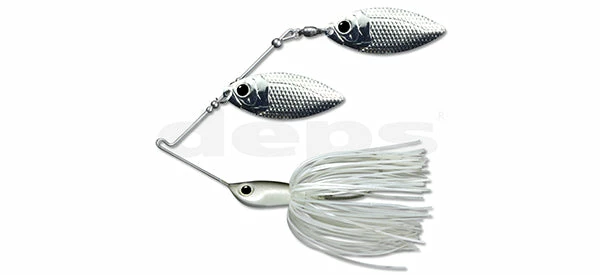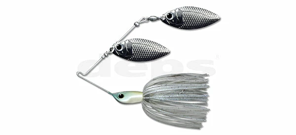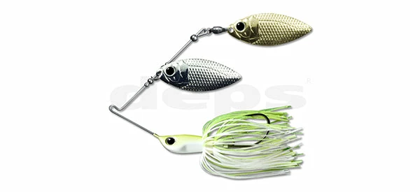 The DEPS B Custom Spinnerbait is the very first bait ever produced by DEPS, and has remained one of the most sought after spinnerbaits ever made. ย Every detail of this bait has a purpose, and this bait really set the stage for finely crafted bass fishing lures. ย The unique head design allow the B Custom to rock side to side, much more lifelike than standard spinnerbaits. ย It also allows the bait to fall horizontally, making this the best lift and fall double willow spinnerbaits ever. ย The custom wire is designed to flex at the optimum angle and tension for maximum hook setting power. ย The custom made blades are not only perfect for fluttering on a vertical drop, but they are set in place with proprietary hollow beading that allows extra vibration under the water, and the removal of the sleeve that is found on most other spinnerbaits allows greater casting distance and much less weed snagging.