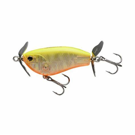 The Ima Helips is a floating prop bait designed with 2 squeaky props, one in front, and one in back, built to churn the water as it moves across the surface making it perfect to work over shallow cover or around bedding bass.ย