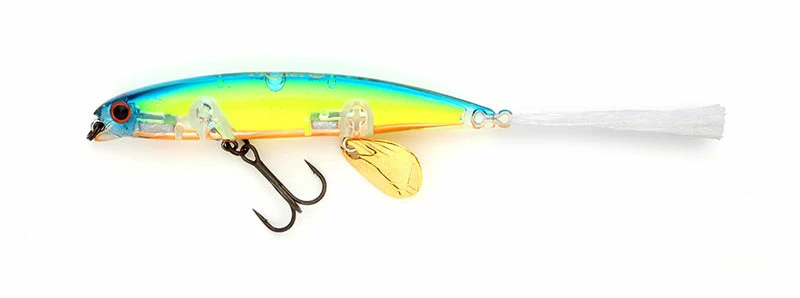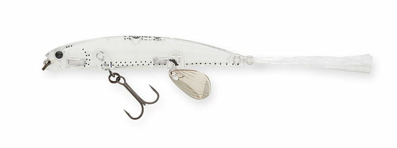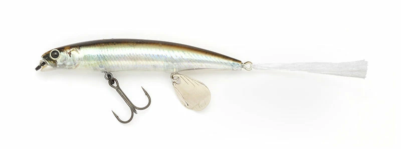 The I-Roller is a new type of minnow that produces only the perfect high-pitch i-shaped roll with dead throw to medium retrieve without swinging the head and tail that are often found in lip-equipped plugs.ย Basic operation is OK just by winding slowly with dead throw to medium retrieve.ย The synergistic effect of natural high-pitch roll with clear color change, flushing, and wavy hair that flutters like a tail fin invites a bite to eat bass.ย Another feature of the eye roller is that it has a shimmy fall function that sinks while rolling during a vertical fall as well as horizontal swimming.ย Taking advantage of this shimmy fall action, it is possible to invite a bass by imagining shrimp hovering by repeating fall and lift as well as swimming.