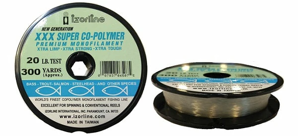 Izorline XXX Super Co-Polymer Monofilament is made os space aged materials to make it “Xtra” Limp, for easy tying; “Xtra” Strong for secure knots and hooksets; and “Xtra” Tough, for long lasting abrasion resistance. Available in 300 yard spools in clear and smoke.