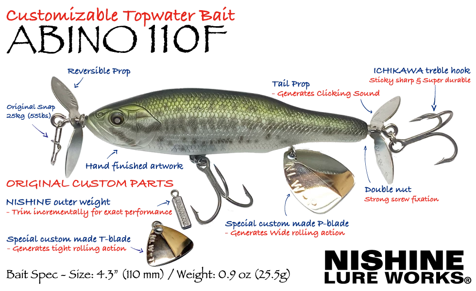 The best lure release at I-Cast 2021 has arrived! ย The Nishine Abino 110F is a fully customizable topwater bait with over 6 years of R&D. ย Each prop blade can be removed or flipped around for different action. ย The belly weight can be used as is for a loud knocking sound or changed out for a tighter action and less knock. ย Adding the Nishine weight in place of the blade allows the bait to wake or slow sink. ย Basically, whatever you can think of, the Abino can do!
