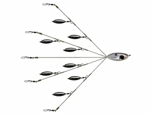 The Picasso Flash Backย is built with a 2-tier blade configuration consisting of eight #1 willow blades that imitates the shiny โflickeringโ commonly seen in baitfish schools. Constructed with low visibility brown wire that allows the fish to focus on the baits being presented instead of the distraction of flashy wires. The lightweight high- impact resistant plastic head and embedded nose swivel prevents line twist and also prevents the fish from leveraging itself off when hooked. No longer does a broken swivel render your Umbrella Rig useless and destined for the trash along with your hard earned money. Features the markets only SLIDING SLEEVE that allows for quick and easy replacement of any damaged or worn terminal swivels. This can be particularly critical during tournament situations when rigging up an entirely new Umbrella Rig can take up much needed time. Equipped with premium American made components including a 140lb strength nose swivel, and heavy duty terminal snap swivels of 75 lb strength to keep your swim baits secure and to assure landing the doubles and even triples that this rig commonly catches. This is a very versatile size than can be used for targeting suspended fish or throwing around docks, blow downs or other structure.