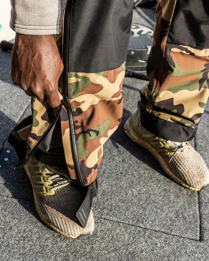- Zippered leg openings for easy on/off and can be cinched down with adjustable hook and loop hem.