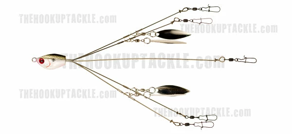 The Ultralight Flash Mob Yumbrella Rig is a variation of the Yumbrella Rig. ย This rig contains 5 arms, 5 snap swivels and four willow leaf blades, which are on swivels. ย This unique set up gives off the impression of a larger school of baitfish, while still maintaining a smaller profile. ย The results have been VERY good so far with this rig!