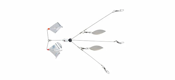 It’s a buzzabait…it’s and a-rig…no its the Wzard Custom Tackle Buzz N Rig! Designed by pro bass fisherman Richard Woodard features counter clock dual buzz blades for extra strike causing noise and two nickel willow blades for flash. The three armed rig allows you to fish not just three baits, but the easily removable  blades and you could fish up to five! it’s the future of fishing- combining two of the best proven techniques in the fishing world into a one of a kind rig.